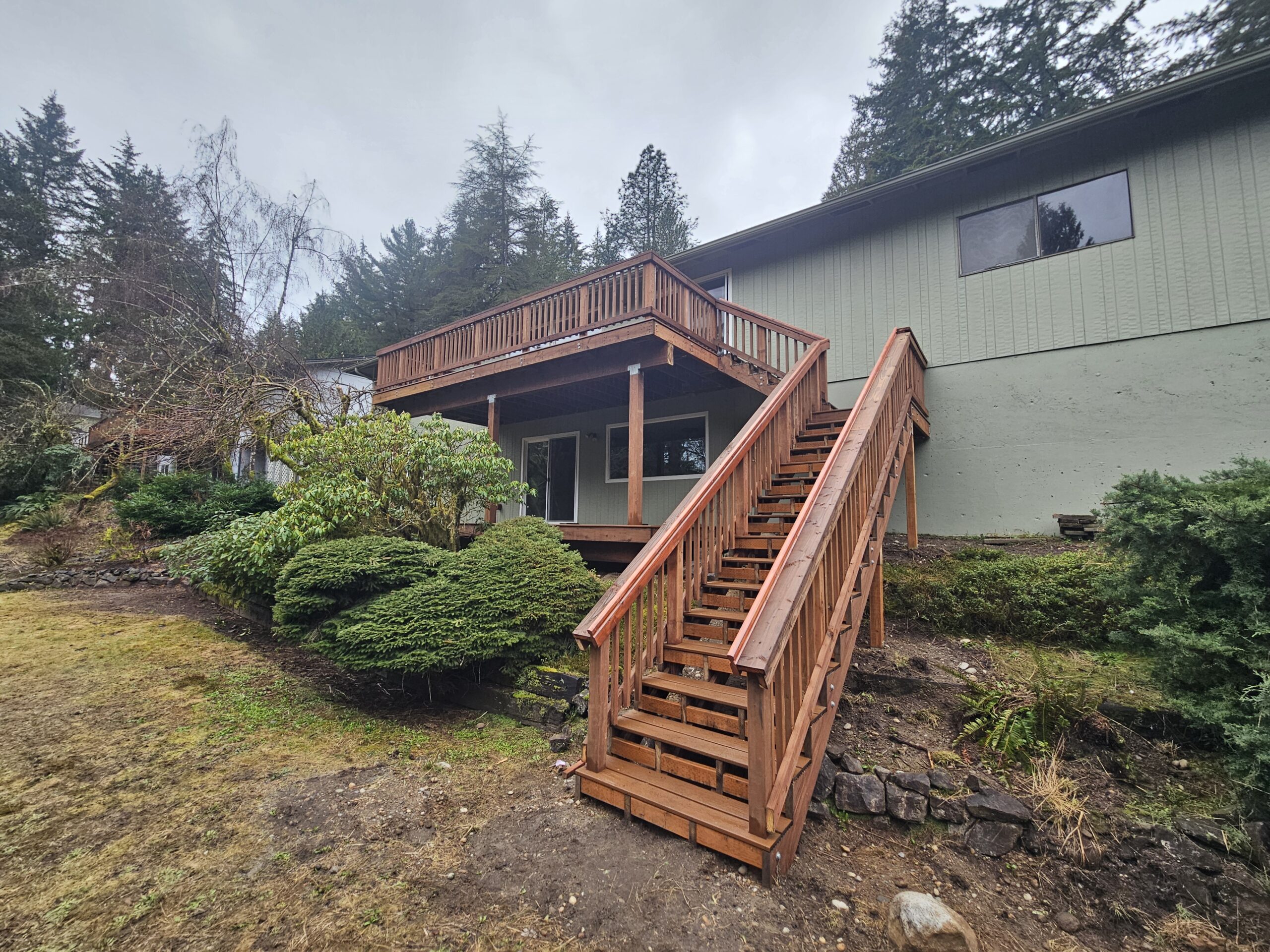 A two-story deck build in Olympia, WA with a large staircase going to the bottom garden.